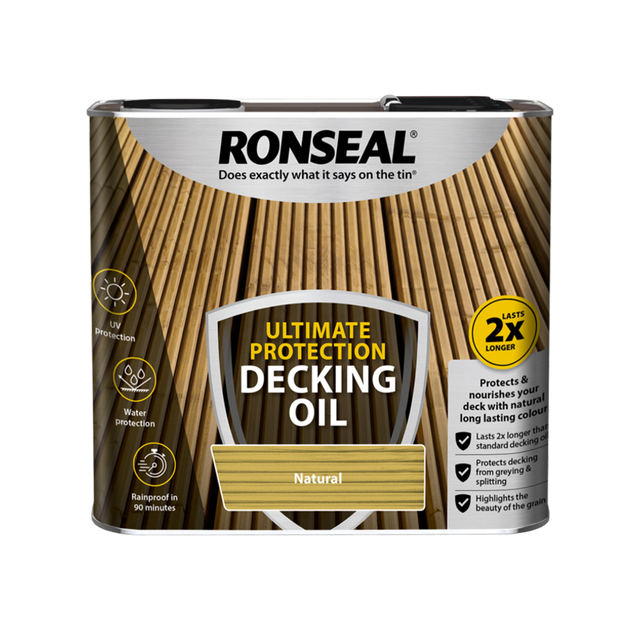 Ronseal Ultimate Protection Decking Oil 2.5L Natural Lasts twice as long as standard decking oils. Rainproof in 90 minutes. Protects from scuffs and scratches. Restores wood oils lost through weathering. Stops wood from greying and splitting. UV protection.