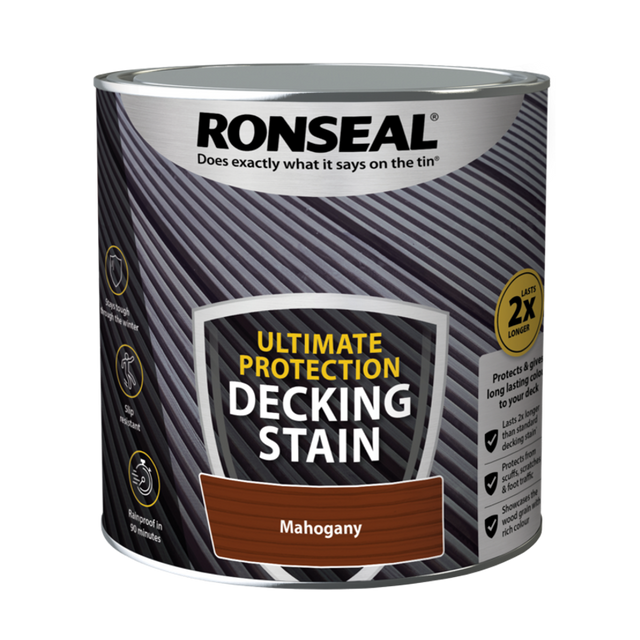 Ronseal Ultimate Protection Decking Stain 2.5L Mahogany Prolongs the life of neglected decks and last 2 times longer. Stays tough through winter. Slip resistant. Rainproof in 90 minutes.