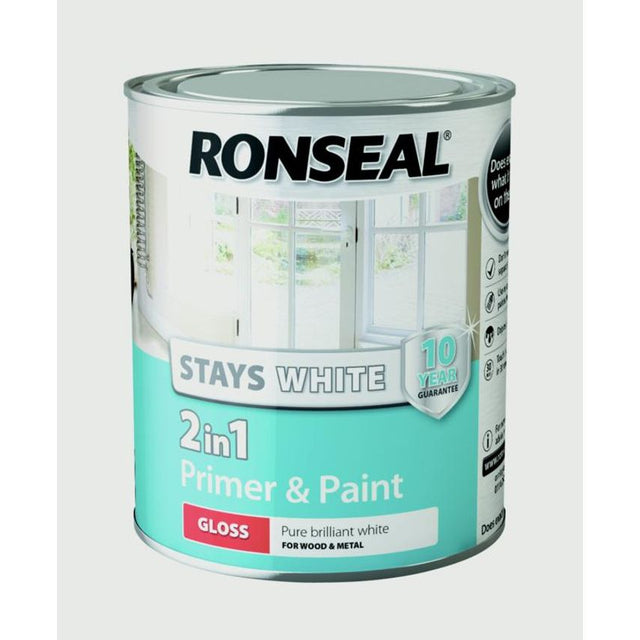Ronseal Stay White 2in1 Primer & Paint White Gloss 750ml Our Stays White 2in1 Primer & Paint is the easiest way to paint bare or worn interior wood. Thats because you dont need to use a separate primer before painting. This paint primes and paints with just one tin. You just need to put on 2 coats, even on bare wood. You can use it on skirting, doors and windows -plus its guaranteed to Stay White for 10 years. No need to use a primer Use on bare or previously painted wood Drip resistant Guaranteed to stay white