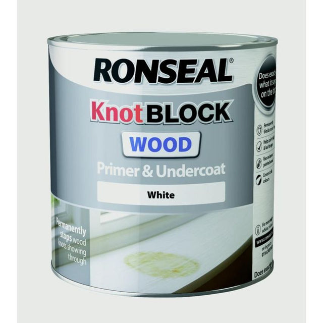 Ronseal Knot Block Primer & Undercoat White 2.5L Our Knot Block Wood Primer & Undercoat completely stops wood knots and wood resins showing through your paint. This primer and undercoat also covers bold colours, dark marks and helps your paint to stick! It makes sure you get a flawless finish that won'y yellow, crack or peel. Perfect for knotty wood like pine. Guaranteed to completely block wood knots Ready to paint over in 4 hours Use on bare or previously painted wood