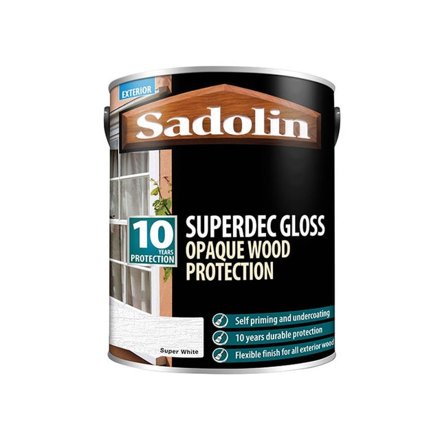 Sadolin Superdec is a water-borne, highly durable opaque finish for cladding and exterior joinery. Wears naturally via weathering, thus ensuring the coating remains flexible and resists cracking, peeling and flaking. It can be applied to new and previously painted or stained surfaces, and is ideal for use where a complete change of colour is required, or where the existing surface has become weathered and uneven in appearance. On very resinous timber to minimise extractive discolouration of the coating (particularly when using Super White) a blocking primer should be used. Specification: Coverage: Planed Softwood: up to 10m/litreDrying Time: Touch Dry 1 Hour, Recoat Time After 16 Hours