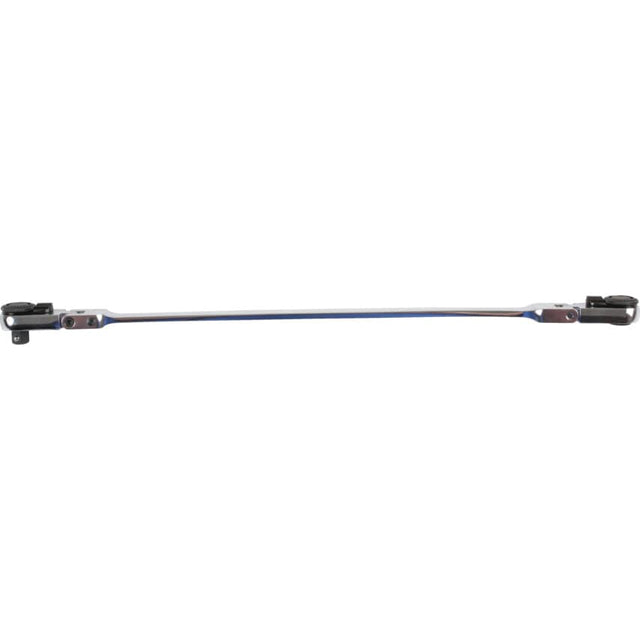 This ratchet and bit driver comes in a 1/4in. size and extra long body for hard to read areas. The product is double ended with a flexi-head ratchet that becomes lockable in any position. One end is a standard 1/4" square drive and the other end is a 1/4" bit driver; both are reversible and lockable. But the big advantage is the flexi-head design -- both heads swivel through a full 180 at the press of the button and lock into the required position. The fully polished ratchet handle is very slim and 300mm long for access to difficult areas, beautifully balanced and fitted with a smooth ratchet mechanism. A professional solution for the busy workshop, and available now from your Laser Tools stockist. Features and Benefits The ratchet is designed with a 72 teeth mechanism for strong grip The length of the product measures at 300mm for tight and hard-to-reach places The ratchet allows forward and reverse function with a 180 flexi-head, able to lock in any position for easy and convenient use Manufactured from polished chrome vanadium for strength and durability Typical Applications For use with 1/4" bit drives