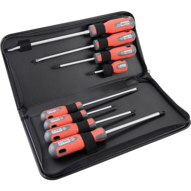 Chrome vanadium steel blades with magnetic tips. Fitted with a unique dual grip triangular handle which has been designed for improved user comfort, allowing more torque to be applied. Manufactured with convenient hanging hole in the handle for storage. Features and Benefits Chrome vanadium steel blades are highly robust Magnetic tips hold the fastener in place to allow the user to apply torque more accurately Dual grip triangular design handle has been uniquely designed for maximum user comfort when driving Each driver possesses a convenient hanging hole for storage Supplied in a zip around wallet for protection and storage of your tools Contents Crosspoint: No.1 x 75, No.2 x 100 PZ: No.2 x 100 Flared: 6.5 stubby, 6.5 x 100, 6.5 x 200 Parallel: 5.5 x 75, 5.5 x 150 Typical Applications Electrical DIY Construction Engineering