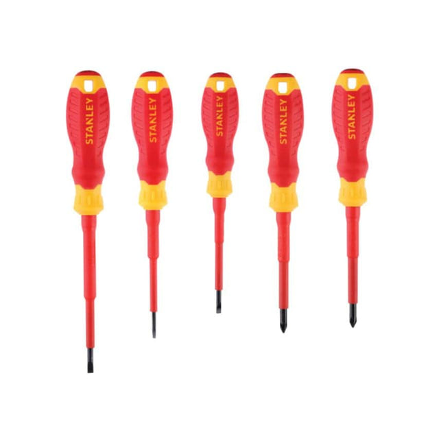STANLEY VDE Screwdrivers have a chrome vanadium steel blade with a hardened tip for increased durability and reduced wear. The tapered, slim insulation allows access without modification and safe working to 1,000V. Fitted with a large diameter, bi-material handle for excellent torque transmission and control. Tested to 10,000V, rated to 1,000V AC. This 5 piece set contains: 3 x Slotted Screwdrivers: 0.4 x 2.5 x 75mm, 0.8 x 4.0 x 100mm and 1.0 x 5.5 x 125mm2 x Pozidriv Screwdrivers: PZ1 x 80mm and PZ2 x 100mm