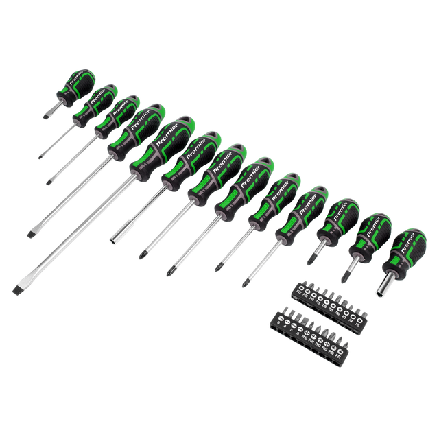 One of a comprehensive range of Premier Hand Tools, suitable for daily professional use. High quality Chrome Vanadium steel satin finished shafts with shot blasted and magnetized tips. Ergonomic polypropylene and TPV rubber soft grip handles maximize power transfer from hand to fixing. Each size clearly marked for quick and easy identification. Includes hanging hole for alternative storage. Lifetime guarantee*.