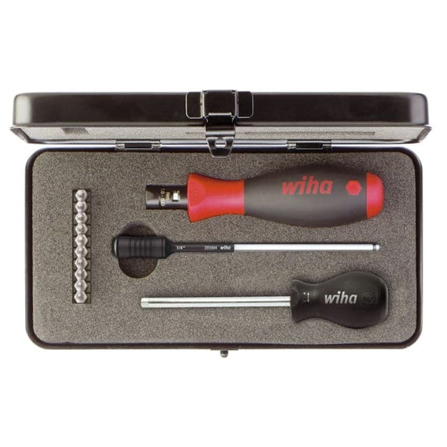 The Wiha TorqueVario-S torque Screwdriver Set is for applications where recommended torque settings are important. Contains the following: 1 x TorqueVario-S torque Screwdriver with a patented SoftFinish handle design, ensuring work is kind to hands and muscles. Recommended by doctors and therapists at the German Campaign for Healthier Backs. The torque screwdriver produces a clearly audible, physically perceptible signal when the torque is produced. Guarantees process safe torque mechanics, protecting against damage to materials and eliminating the need for retouching. Complies with EN ISO 6789 requirements. 1 x Clamping Bit Holder with Ball end. 1 x Setting Tool. 5 x 25mm TORX Bits: T7, T8, T9, T10 & T15. 4 x 25mm TORX PLUS Bits: 7IP, 8IP, 9IP, 10IP & 15IP. 1 x High