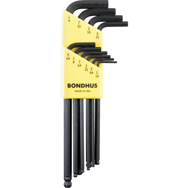 Supplied as a 10 piece set, these imperial ball end hex keys are suited for work in hard to reach places and restricted areas. They possess superior ball end strength and a 25 working angle on the long arm and a plain-ended short arm. Held together in a plastic clip for ease of storage and transportation.
