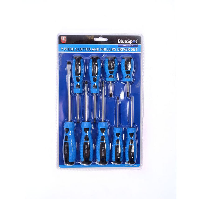 The BlueSpot 9 PCE Screwdriver Set features a range of popular screwdriver sizes. Manufactured from chrome vanadium for increased durability. Ideal for use around the home and workplace.
