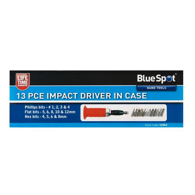 The BlueSpot 13 PCE Impact Driver In Case is manufactured from hardened carbon steel for increased strength and durability. The impact driver has a heavy-duty soft-grip handle to maintain grip during use. The bit selection is suitable for most bolts/screw types and includes : Phillips bits - # 1, 2, 3 & 4. Flat bits - 5, 6, 8, 10 & 12mm. Hex bits - 4, 5, 6 & 8mm. Ideal for the removal of seized or corroded bolts and screws when used with a hammer. Supplied with a handy carry case for easy transport and storage.