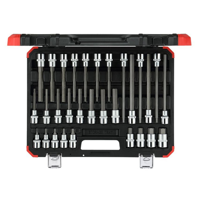 Square drive acc. to DIN 3120 - C 12.5, ISO 1174, with ball retention groove Screwdriver bit socket 1/2", hex, metric , with pressed-in, phosphated pin, non-slip knurled head, brightly polished on the drive side, design based on DIN 7422 Chrome-vanadium steel, matt satin chrome-plated For hand-operated screw work Plastic case in the GEDORE red Design Clamp-secured tools Metal hinges/lock
