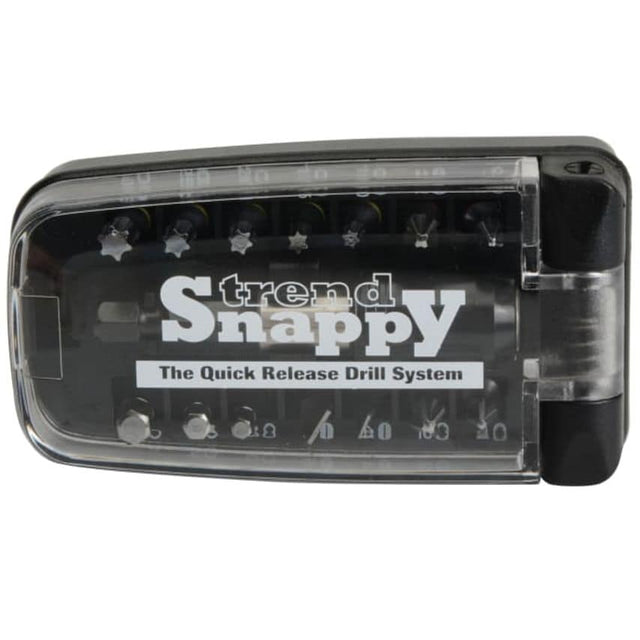 This Trend Snappy Screwdriver Bit Set covers a wide range of screwdriving applications and screw head types. Ideal for the workshop or toolkit, each bit is made from high grade hardened tool steel with a reduced shank and torsion zone area to reduce strain on the bit as it drives. This minimising breakage under heavy load and reduces cam out for superior torque transmission. Colour coded rings on each bit shank ensures correct, quick and easy bit selection every time.This set is supplied in a flip lid storage container with belt clip, keeping everything close to hand as you work. Contains: 2 x 25mm Phillips Bits (Red Ring) : PH1, PH2.2 x 25mm Pozi Bits (Blue Ring) : PZ1, PZ2.5 x 25mm TORX Bits (Yellow Ring) : T10, T15, T20, T25, T30.2 x 25mm Slotted Bits (Red/Orange Ring) : 4 x 0.6mm, 6 x 0.9mm.3 x 25mm Hex Bits (Yellow/Orange Ring) : 3, 4, 5mm A/F.1 x Magnetic Bit Holder.