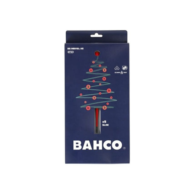 1 x Bahco XMAS BE-9881SL ERGO Slim VDE Insulated Screwdriver Set, 5 Piece.Bahco ERGO VDE Insulated Screwdrivers are suitable for work on live equipment, up to 1, 000 volts, high quality blade insulation moulded directly onto the blade. The high-performance alloy steel blade has been chrome plated and entirely hardened for high protection against corrosion, long life tool. A black oxide tip provides higher accuracy.Developed according to the scientific ERGO process. A three-component handle provides maximum user comfort. The soft material with ridged surface provides superior grip and greater force transmission. A flat face prevents the screwdriver from rolling away. It's easy to choose the right tip, thanks to the colour-coded handle* and permanent symbol on the domed end.Each screwdriver is individually inspected and manufactured according to IEC 60900, tested in a water bath at 10, 000V.This set of 5 contains:3 x Slotted Slim Screwdrivers: 3 x 100mm, 4 x 100mm, 5.5 x 125mm2 x Phillips Slim Screwdrivers: PH1 x 80mm, PH2 x 100mm*No colour identification in extra small handle , size 3.0 (BE-8220SL) .