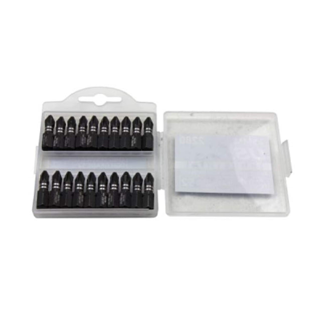 Impact bits with a torsion zone, to allow the screwdriver bit to flex for reduced breakage and to withstand the changes of load associated with high torque use. Long Service Life Torsion zone for increased durability Specially designed for impact drivers Precision profile for better fit Magnetic tip to aid holding and starting DIN 8764 standard Taiwan S2 grade steel construction HRC60-61 hardened for optimum strength Black phosphate coating for corrosion protection and increased life Storage case Details: Drive: 1/4" Hex Length: 25mm Profile: PZ2 Quantity: 20 pieces Box contains10 packs of 20