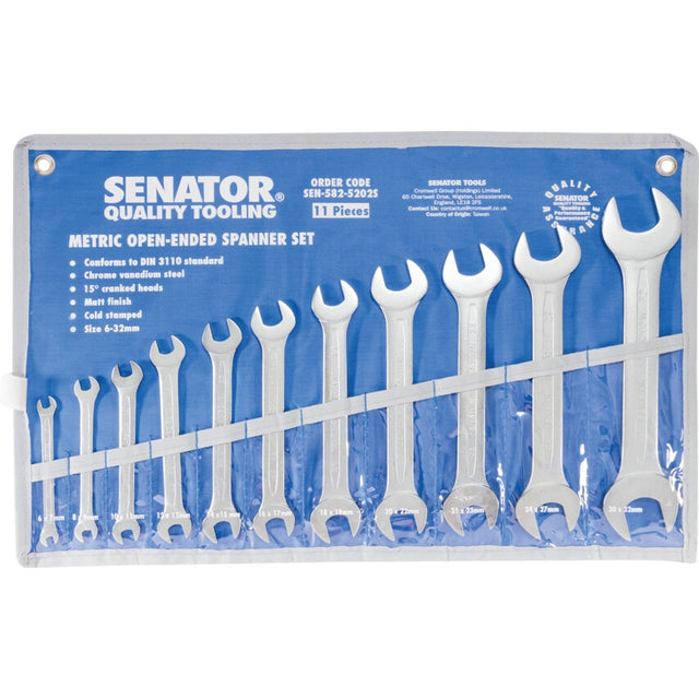 Set of 11 chrome vanadium open-ended spanners. Size range: 6-32mm. Conformance to DIN 3110 standard.