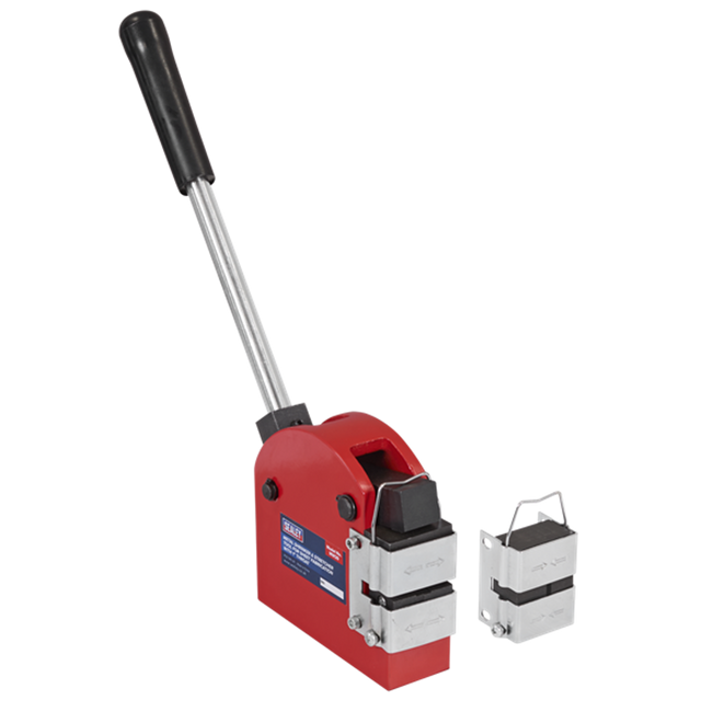 Fabricate and repair panels with ease, shaping metal using both shrinking and stretching jaws. Create smooth radius curves in sheet metal without the need for cutting, welding, heating or hammering. Shrinker contracts sheet metal for inside curves, while the stretcher expands sheet metal for outside curves, forming curves to a radius as small as 76mm/3''. Hand-operated press with 45:1 leverage and a 356mm/14'' handle, allowing for easy operation. Constructed with mild steel capacity of 1.2mm/18 gauge and aluminium capacity of 1.6mm/16 gauge, featuring jaw clearance of 3.2mm/1/8 inch and a throat of 25.4mm/1 inch.