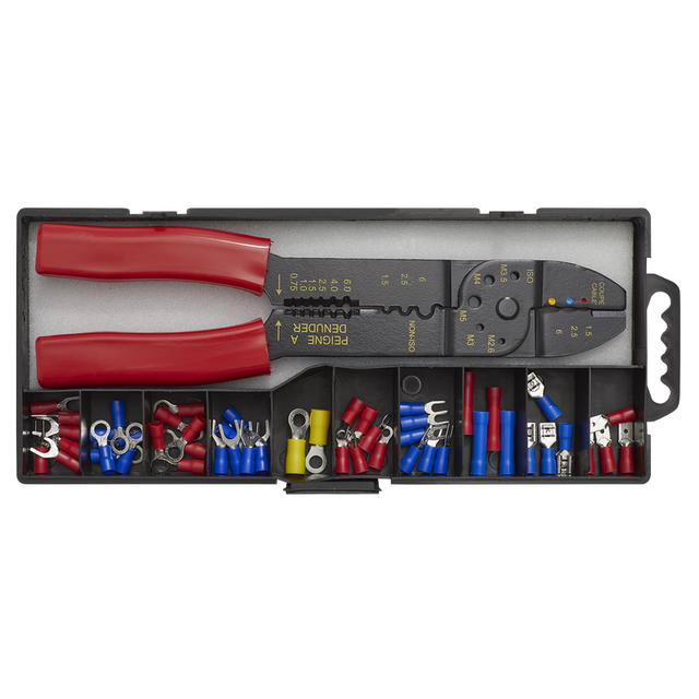 230mm Long, 4-way crimping tool crimps terminals, strips wires, cuts screws and wires. Handles both insulated and non-insulated terminals 1.5, 2.5 and 6mm. Strips wires 0.75, 1, 1.5, 2.5, 4 and 6mm. Screw cutting capacity from M2.6-M5. Safety insulated handle grips. Supplied with approximately 50 assorted terminals and connectors in a handy storage case.