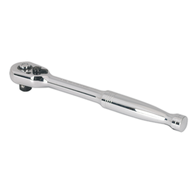 Chrome Vanadium steel ratchet wrench. Hardened, tempered and finished in deep polished high chrome. Slim style contoured handle with pear-head design. Features include 45-tooth ratchet, flip reverse and push-button quick release mechanism.