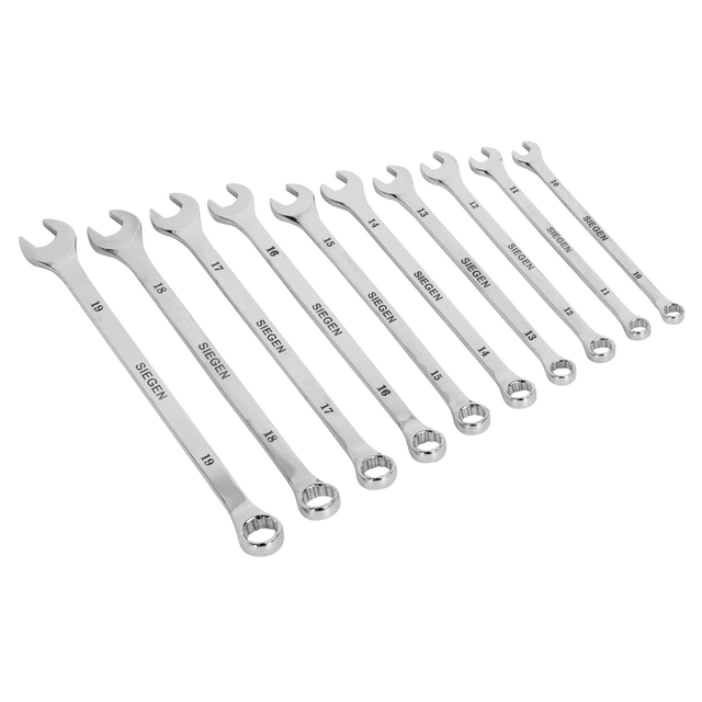 Drop-forged Chrome Vanadium steel combination spanners. Hardened, tempered and nickel chrome plated for corrosion resistance with a fully polished mirror finish. Extra-long shaft with open end and 12-point WallDrive ring combination. Supplied in storage/carry rack.