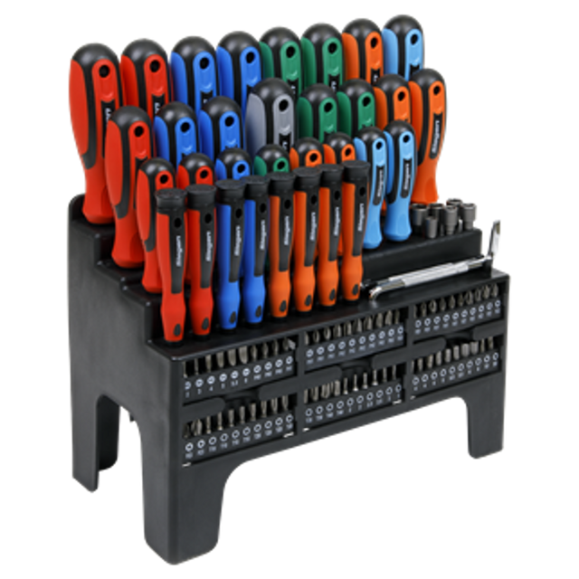 Selection of popular sized screwdrivers, nut drivers, bit driver and 60 bits. Chrome Vanadium steel satin finish shafts with shot blasted and magnetized tips. Contoured soft grip handles with colour-coding for fast identification. Supplied with wall mountable display stand which features a built-in magnetizer/demagnetizer.