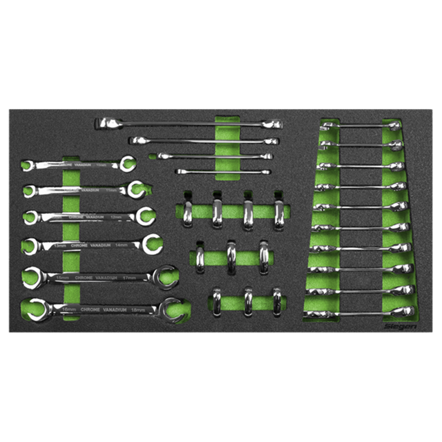 Tool Tray with Specialised Spanner Set. Suitable for tool chest Model No's AP3503TB, AP3505TB and AP3508TB.;Contents: Stubby Combination Spanners; 10-19mm, TRX-Star* Double Ended Spanners; E6-E24, Flare Nut Spanners; 8-18mm, 3/8"Sq Drive Crow's Foot Spanners; 10-19mm.