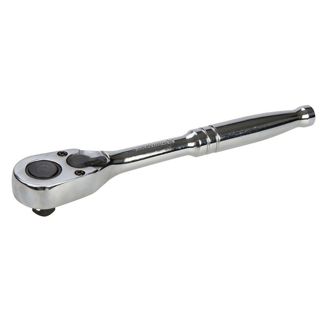 Slim, ergonomic, hardened and tempered chrome vanadium handle. Single-handed reversible ratchet mechanism and positive socket locking mechanism with single-handed push-to-release. Features tough Cro-Mo gears for high torque application and 72 teeth for fine, 5 ratchet action. Manufactured to DIN 3122.