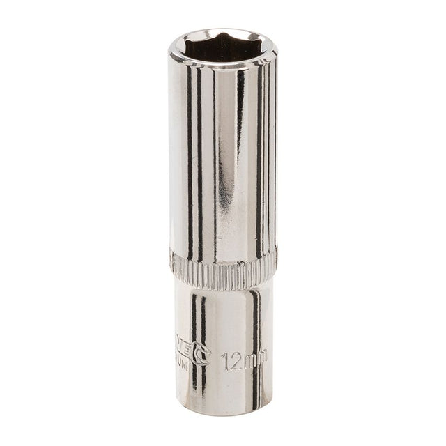 Deep 6-point hex socket for maximum torque transfer to the face of the fastener. Precision cold-forged, hardened and tempered chrome vanadium steel. Fully polished and nickel chrome plated for durable corrosion resistance. Chamfered ends and thin walls for positive location on fastener. Knurled ring provides grip and control in the hand, and bearing hole provides solid connection to the tool.