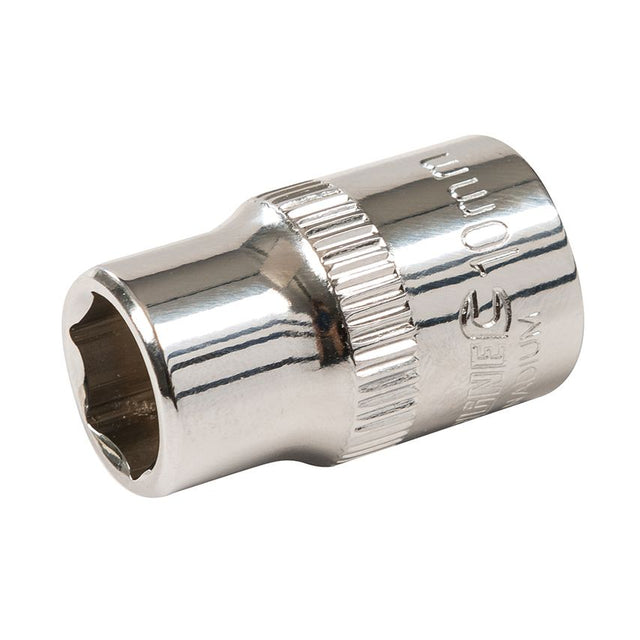 6-point hex socket for maximum torque transfer to the face of the fastener. Precision cold-forged, hardened and tempered chrome vanadium steel. Fully polished and nickel chrome-plated for durable corrosion resistance. Chamfered ends and thin walls for positive location on fastener. Knurled ring gives grip and control in the hand, and bearing hole provides solid connection to the tool.