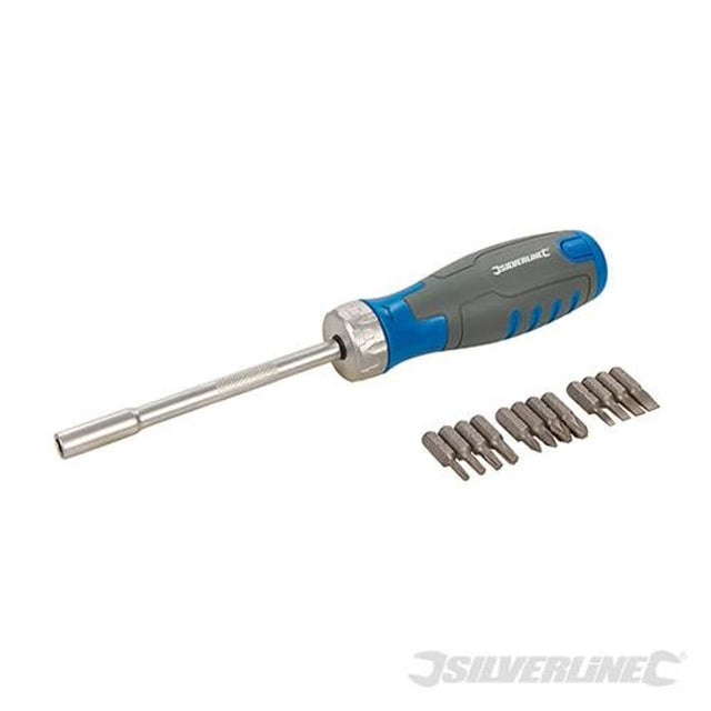 Allows access to obscure and confined fixings. 3-position ratchet action, 1/4" magnetic drive sockets and soft-grip driver handle for firm control. Forward, reverse and locked positions. Bits are cleverly stored in the rotating handle. Includes slotted: 3, 4, 5 and 6mm; PZ: PZ0, PZ1, PZ2 and PZ3; Trx: T10, T15, T20 and T25.