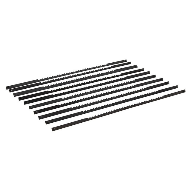 Hardened carbon steel, for cutting wood, plastic and non-ferrous metal. Alternate off-set cutting length. 3mm wide x 0.4mm thick. Length 130mm.