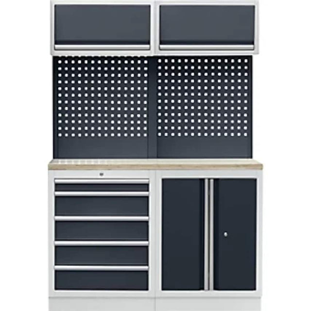 Workshop cupboard system with hinged door and drawer base cupboard, WxD 1360 x 460 mm, light grey/charcoal. Supplied = flat pack. Width = 1360 mm. Depth = 460 mm. Max. drawer load = 35 kg. Number of drawers = 5 pcs. Drawer height = 1x74, 4x153 mm. Drawer extension = 100%. Body colour = light grey RAL 7035. Front colour = charcoal. Material = steel, powder coated. Number of doors = 2 pcs. Number of shelves = 1 pcs. With drawer cupboard, double door cupboard, worktop, perforated panel and 2 wall mounted cupboards. Powder coated steel construction. Body in light grey RAL 7035, fronts in charcoal RAL 7016. Consisting of - 1 x drawer base cupboard with 5 drawers: with ball bearing mounted telescopic guides, HxWxD 910 x 380 x 460 mm - 1 x hinged door base cupboard: includes 1 drawer, upper side open with cylinder lock, HxWxD 910 x 680 x 460 mm - 1 x Multiplex worktop for 2 base cupboards - 2 x wall mounted cupboard with front flap: flap with gas pressure cylinder - 2 x perforated panel: HxW 1052 x 614 mm - 1 x perforated panel connector: LxW 1420 x 65 mm - 2 x perforated panel end connector: LxW 1420 x 32 mm Assembly service for office furniture Delivery - Assembly - Packaging removal. Available at cost on request.