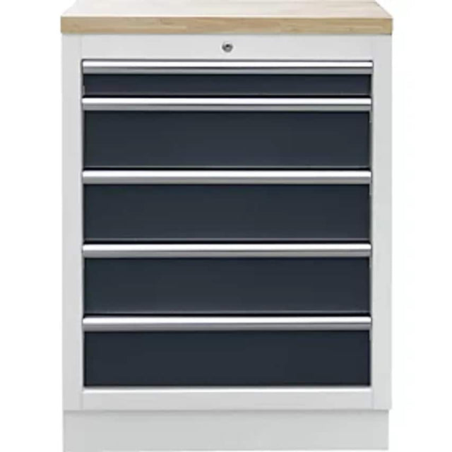Drawer base cupboard, with 5 drawers, HxWxD 910 x 680 x 460 mm. Supplied = flat pack. Height = 910 mm. Width = 680 mm. Depth = 460 mm. Max. drawer load = 35 kg. Number of drawers = 5 pcs. Drawer height = 1x74, 4x153 mm. Drawer extension = 100%. Body colour = light grey RAL 7035. Front colour = charcoal RAL 7016. Material = steel frame construction, powder coated. Drawer guide = with drawers on ball bearing telescopic runners. Max. shelf load = 35 kg. Open at the top - please select worktop separately. Powder coated steel construction. Body in light grey RAL 7035, fronts in charcoal RAL 7016. Ball bearing mounted telescopic guides, 100% extendable. Max. drawer load 35 kg. Upper side without wooden panel. HxWxD 910 x 680 x 460 mm. Note: The cupboard housing is open at the top. A multiplex worktop - to suit the length of the workstation - needs to be ordered separately (see Combinations) The workshop of your dreams is just 5 steps away 1. Choose the number of base cupboards All cabinets with open housing lid. Base unit below multiplex or stainless steel worktop. Can also be used individually in combination with a 680 mm wide worktop. 2. Choose the number of perforated panels and connectors 1 perforated panel per base cupboard possible. Several perforated panels are connected using connecting elements and installed on the base cupboard. Perforated panels that end to the left of right of the wall cupboard are fitted with an end connecting element. 3. Choose the worktop For mounting above 1, 2 or 3 base cupboards. 4. Choose the number of wall mounted cupboards One wall mounted cupboard can be mounted on each perforated panel. 5. Choose the full height cupboards Single or double door full height cupboards can be mounted on the left or right side of the wall cupboard respectively. When connected to a perforated panel, a connecting element is required. This item is a component of a modular workshop cupboard system. Put together your very own workshop of your dreams, or order a preconfigured complete offer. All items can be found under Combinations.