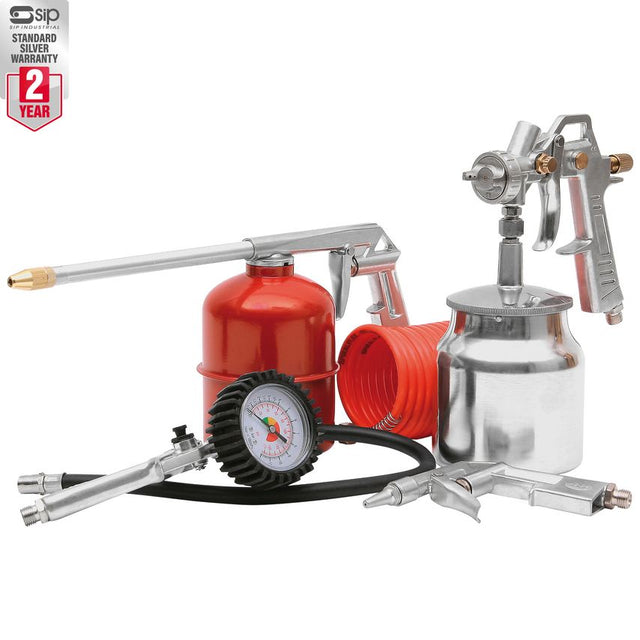 The SIP 5pc Air Accessory Kit is general starter kit featuring a 1.5mm suction-fed spray gun with adjustable fluid and air control, plus inflator, degreaser, and duster guns, and 5mtr kink-resistant hose.