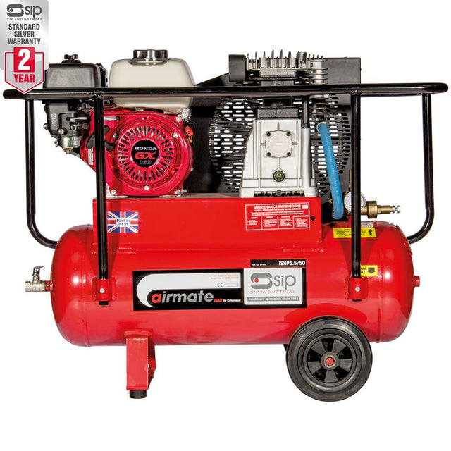 The SIP ISHP5.5/50 comes into its own in a range of professional and industrial settings thanks to a robust yet compact build featuring a HONDA GX160 163cc EURO V petrol engine, durable receiver, and splash oil lubrication system. This unit is part of a range of powerful SIP compressors with HONDA engines, and includes wheel-mounted and static options, and electric-starting models. Heavy-duty HONDA GX160 163cc EURO V petrol engine Splash oil lubrication helps to prevent engine damage Compact and wheel-mounted design for easy movement Multi-finned flywheel with large-finned cylinder head for increased cooling and optimal heat dissipation and high performance Built-in safety valve and automatic unloader valve Assembled and thoroughly tested by SIP in the UK SIP 10 year receiver anti-corrosion warranty SIP 2-Year Standard Silver Warranty HONDA 3 Year Engine Warranty
