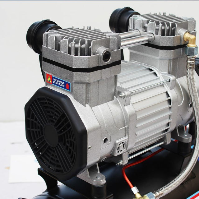 LARGE TWIN-CYLINDER MOTOR PUMP UNIT WITH SLOW-RUNNING 4-POLE MOTOR ACHIEVES LOW NOISE LEVELS & HIGH AIRFLOW PLUS OIL-FREE FOR LOW MAINTENANCE USE: Slow-running 4-pole motor operates at lower speeds for longer life performance (1.5hp/1.1kW) Powerful motor pump unit operates at an ultra low 59dB and supports high airflow of 8CFM piston displacement and 6.5CFM Free Air Delivery (FAD) Large motor fan improves cooling to maintain pump temperature and output. Oil-free for low maintenance use. This ensures no carry-through which delivers cleaner air to tools and equipment. Also transports more easily compared to oil-lubricated models with more potential to spill. Braided delivery hose offers added durability.