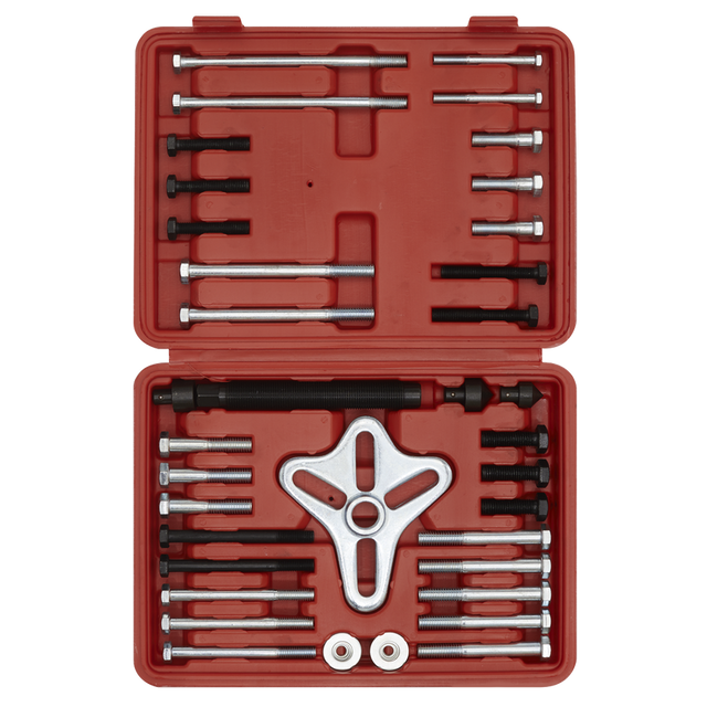 Multipurpose puller set for extracting flywheels and pulleys. Supplied in storage case.