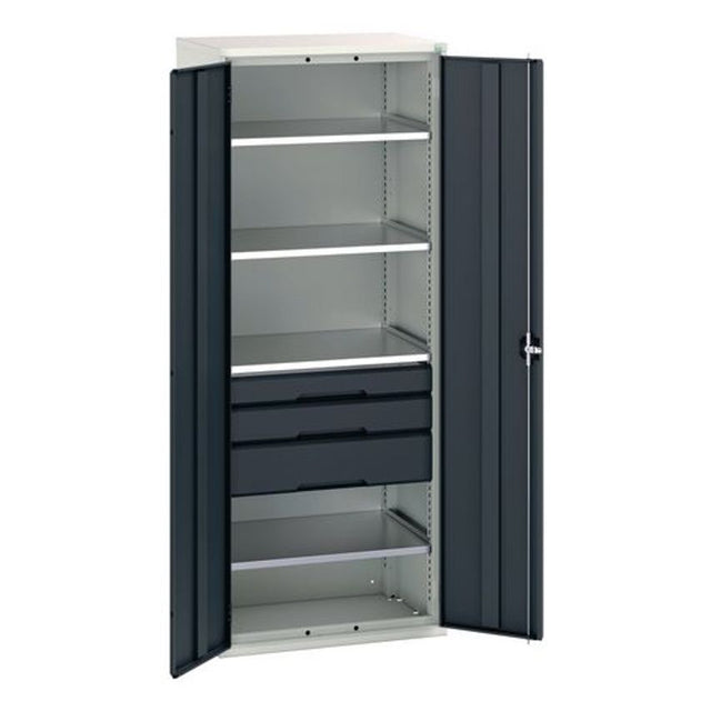 Combined drawer and shelf storage.Welded steel construction with reinforced doors. Double locking doors. Galvanised shelves, capacity:60kg.Roller bearing drawers, capacity:60kg.All models 550mm deep.10 year guarantee.UK made.More options available on line.