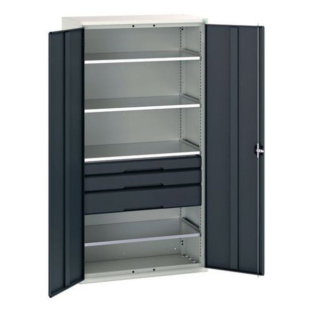 Combined drawer and shelf storage.Welded steel construction with reinforced doors. Double locking doors. Galvanised shelves, capacity:60kg.Roller bearing drawers, capacity:60kg.All models 550mm deep.10 year guarantee.UK made.More options available on line.