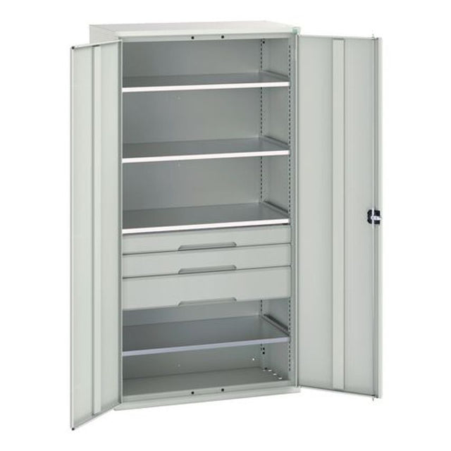 Combined drawer and shelf storage.Welded steel construction with reinforced doors. Double locking doors. Galvanised shelves, capacity:60kg.Roller bearing drawers, capacity:60kg.All models 550mm deep.10 year guarantee.UK made.More options available on line.