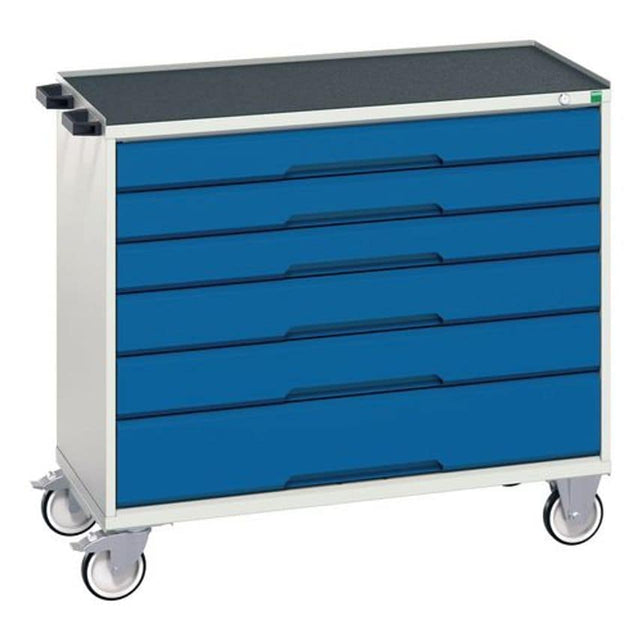 Welded steel construction with push pull handles.Metal top tray with 3 raised edges and inlaid mat.5 lockable drawers, drawer blocking to prevent accidental opening, 100% extension roller bearing, 50kg UDL capacity.3 x 100mm high drawers, 3 x 175mm high drawers.125mm dia. rubber tyred castors.Two fixed and two swivel with brake.UK made.10 year guarantee.