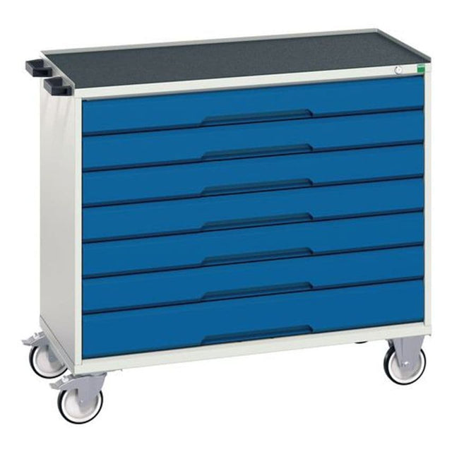 Welded steel construction with push pull handles.Metal top tray with 3 raised edges and inlaid mat.7 lockable drawers, drawer blocking to prevent accidental opening, 100% extension roller bearing, 50kg UDL capacity.6 x 100mm high drawers, 1 x 175mm high drawers.125mm dia. rubber tyred castors.Two fixed and two swivel with brake.UK made.10 year guarantee.