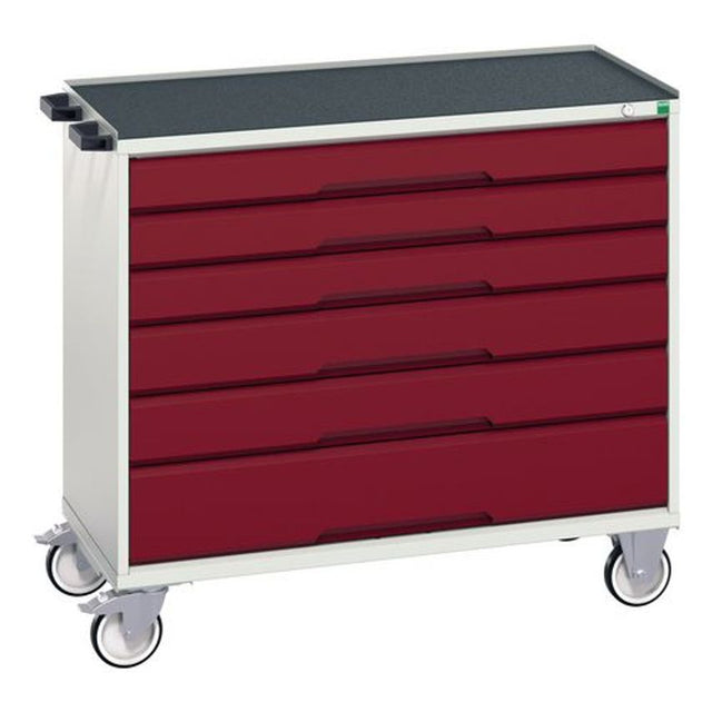 Welded steel construction with push pull handles.Metal top tray with 3 raised edges and inlaid mat.5 lockable drawers, drawer blocking to prevent accidental opening, 100% extension roller bearing, 50kg UDL capacity.3 x 100mm high drawers, 3 x 175mm high drawers.125mm dia. rubber tyred castors.Two fixed and two swivel with brake.UK made.10 year guarantee.