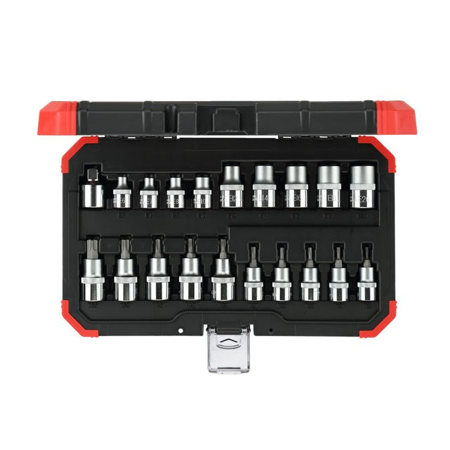 Coupler in acc. with DIN 3120, ISO 1174, with ball locking device Square drive as per DIN 3120, ISO 1174, with ball retention groove Socket 3/8 + 1/2, recessed TX Screwdriver bit socket 3/8 + 1/2 TX with pressed-in, phosphated pin Reducer 1/2" to 3/8" Chrome-vanadium steel, matt satin chrome-plated For hand-operated screw work Plastic case in GEDORE red Design Clamp-secured tools Metal hinges/fastener