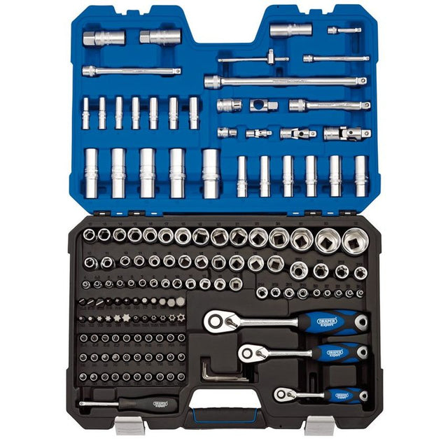 Expert Quality, six point sockets made from chrome vanadium steel that's hardened and tempered with a micro satin finish. Each socket has a knurled ring for extra grip. Supplied with a 72 tooth reversible soft grip ratchet and accessories. Packed in a tough plastic storage case with soft grip handle.|13 x 1/4" sq. dr. sockets: 4, 4.5, 5, 5.5, 6, 7, 8, 9, 10, 11, 12, 13, 14mm7 x 1/4" sq. dr. deep sockets: 6, 7, 8, 9, 10, 11, 12mm5 x 1/4" sq. dr. E - sockets: E4, E5, E6, E7, E81 x 1/4" sq. dr. 72 tooth reversible ratchet with soft grip handle and "quick release" button1 x 1/4" sq. dr. universal joint1 x 1/4" sq. dr. spinner handle2 x 1/4" sq. dr. wobble extension bars: 50, 100mm1 x 1/4" sq. dr. sliding T - bar4 x 1/4" sq. dr. plain slot bits: 4, 5, 6, 7mm3 x 1/4" sq. dr. cross slot bits: No.1, 2, 33 x 1/4" sq. dr. PZ Type bits: No.1, 2, 38 x 1/4" sq. dr. Torq bits: T8, T9, T10, T15, T20, T25, T27, T308 x 1/4" sq. dr. Tamperproof Torq socket bits: T8, T9, T10, T15, T20, T25, T27, T304 x 1/4" sq. dr. hex socket bits: 3, 4, 5, 6mm10 x 3/8" sq. dr. sockets: 10, 11, 12, 13, 14, 15, 16, 17, 18, 19mm6 x 3/8" sq. dr. deep sockets: 10, 11, 12, 13, 14, 15mm5 x 3/8" sq. dr. E - Sockets: E10, E11, E12, E14, E161 x 3/8" sq. dr. 72 tooth reversible ratchet with soft grip handle and "quick release" button1 x 3/8" sq. dr. universal joint1 x 3/8" sq. dr. wobble extension bar 150mm1 x 3/8" sq. dr. coupler1 x 3/8" sq. dr. spark plug socket 10mm17 x 1/2" sq. dr. sockets: 10, 11, 12, 13, 14, 15, 16, 17, 18, 19, 20, 21, 22, 24, 27, 30, 32mm5 x 1/2" sq. dr. deep sockets: 16, 17, 18, 19, 22mm3 x 1/2" sq. dr. E - sockets: E18, E20, E241 x 1/2" sq. dr. 72 tooth reversible ratchet with soft grip handle and "quick release" button1 x 1/2" sq. dr. universal joint2 x 1/2" sq. dr. wobble extension bars: 125, 250mm1 x 1/2" sq. dr. coupler2 x 1/2" sq. dr. spark plug sockets 12, 14mm1 x 1/2" sq. dr. 3 - way adaptor3 x 1/2" sq. dr. plain slot bits: 8, 10, 12mm2 x 1/2" sq. dr. cross slot bits: No.3, 42 x 1/2" sq. dr. PZ Type bits: No.3, 46 x 1/2" sq. dr. Draper TX - STAR bits: T30, T40, T45, T50, T55, T608 x 1/2" sq. dr. Draper TX - STAR tamperproof bits: T30, T40, T45, T50, T55, T604 x 1/2" sq. dr. hex bits: 7, 8, 10, 12, 14mm5 x Hex keys: 1.5, 2, 2.5, 3, 4mm|Manufactured and tested generally in accordance with DIN3122 and ISO3315 Specifications