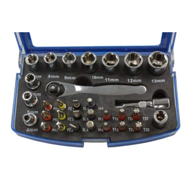 This set contains a range of popular sockets and bits along with a ratchet wrench and extension bar.