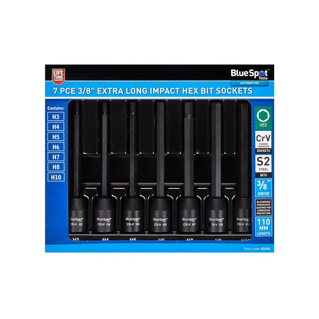 The Blue Spot Tools 7 Pce 3/8" Extra Long Impact Hex Bit Sockets are ideal for use with 3/8" tools. The sockets are manufactured from heat treated chrome vanadium for increased durability. The bits are manufactured from heat treated S2 steel. Supplied in plastic tray for convenient storage.