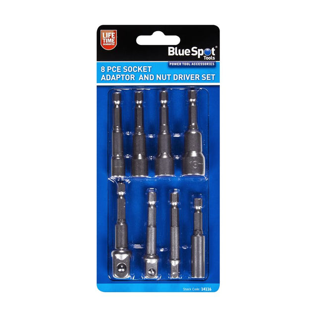 The Blue Spot Tools 8 PCE Socket Adaptor and Nut Driver Set is manufactured from chrome vanadium for increased durability. All 3 Socket Adaptors 1/4", 3/8" & 1/2" feature a 1/4" hex shank and a ball bearing for a secure hold of the sockets and the 4 Nut Drivers 6-8-10-13mm feature a 1/4" hex shank and contain heavy duty magnets to securely hold self drilling screws and any hex head application the set comes complete with a 1/4" hex shank magnetic bit holder.