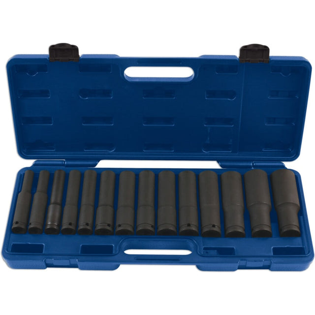 This versatile set of extra deep, 1/2in. square drive impact sockets feature a single hex (6pt) profile. Complete with fourteen pieces, it covers sizes from 10mm to 32mm and caters to various tasks in a range of industries. Crafted from durable materials, these sockets ensure reliable performance in high-torque environments and are ideal for tightening fasteners securely.