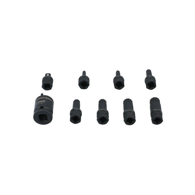 The Dual-Drive Spline Impact Bit Set provides versatile options for impact tool use. Its adaptor and locking coupler offer both 1/2" and 3/8" drives, catering to various applications like automotive repairs and machinery maintenance. Crafted from durable chrome molybdenum, the bits withstand rigorous use. With a 17mm Hex head, they accommodate spanners or ratchet wrenches in tight spaces. Packaged in an EVA foam storage tray, this professional set ensures convenient and organized tool storage.