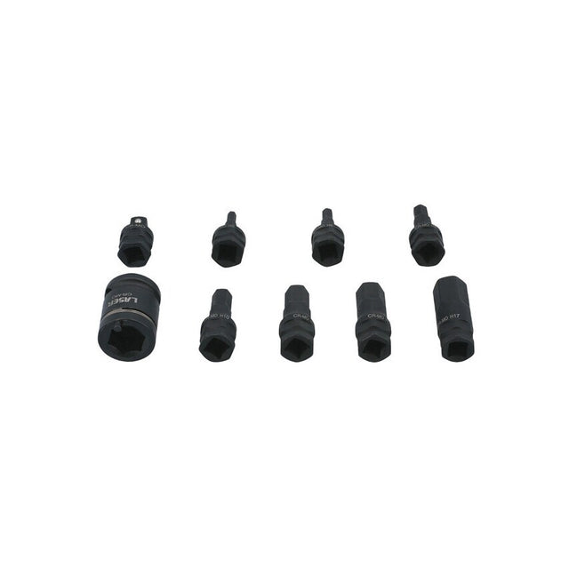 Introducing the 9-piece Dual Drive Hex Impact Bit Set, designed for versatility and convenience. Common applications include automotive repairs, machinery maintenance, and construction projects. This set allows bits to be driven via 1/2"D or 3/8"D power tools or wrenches, offering flexibility. Featuring a 17mm Hex on the end, it can also be used with a spanner or ratchet wrench in tight spaces, ensuring ease of use.