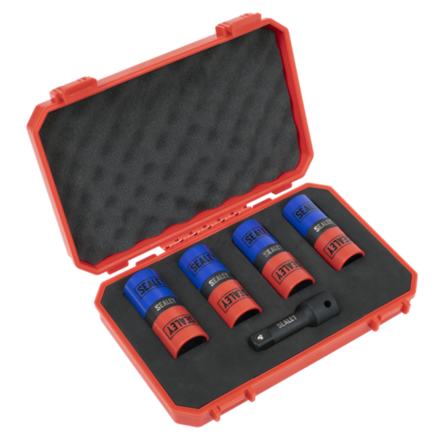 Chromium-plated caps fitted to some wheel nuts are prone to swelling, making them incompatible with standard whole-size sockets. Half sizes allow the secure fitment for safe removal. Chrome molybdenum socket is hard-wearing, tempered and anodised for corrosion resistance. Durable thin-walled design for use with impact tools. Double-ended 6-point socket is externally sleeved to prevent damage to alloy wheels and nuts. Socket sizes 18.5 x 19.5, 19 x 21, 21 x 21.5, 22 x 22.5mm with a 75mm 1/2"Sq Drive Extension.